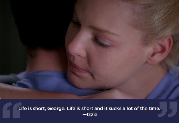 SPOILER ALERT DON’T READ THIS IF YOU AREN’T PAST SEASON TWO: Seriously though, George is probably the greatest person on the show, yet they kill him off. Izzie gets cancer, Teddy loses the love of her life, and some of the patients you want to pull through end up dying. It totally fulfills the adage that life isn’t fair.
