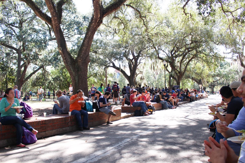A UF tradition, Krishna Lunch is a delicious, all-you-can-eat vegetarian and vegan buffet that has been prepared and served daily by volunteers/devotees of the ISKCON of Gainesville since 1971, when Gargamuni Swami, the first Hare Krishna to come to Gainesville, began chanting and giving out food at the plaza to anybody who passed by him. Krishna Lunch is an extremely economical and nourishing alternative to most of the unhealthy food venues currently populating campus, providing unlimited servings of the day’s entrée, dessert, and refreshment to anyone who pays the $5 “donation” to receive a lunch waiver. More economical still, students and faculty alike can purchase lunch waivers in bulk-packs of 10 for $3.50 a piece, yielding unrivaled savings for even the poorest bohemians and hipsters among us! Served religiously from 11 a.m. to 1:30 p.m., the Krishnas consistently hold steady to their mission “to distribute as much karma-free food as possible, without wasting a scrap,” in addition to offering one of the best meal bargains on campus.