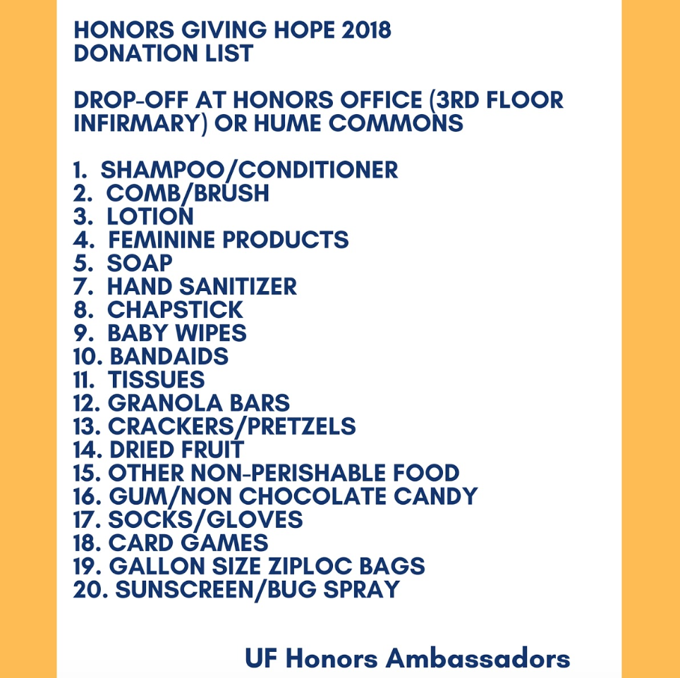 For the first time ever, the Honors Ambassadors is collecting toiletry items for the Gainesville homeless until March 16, said Corie Evans, an Honors Ambassador and the co-chair for Honors Giving Hope. Evans said the group is collecting items for the service project in the Honors Program office and in the lobby of Hume Hall.
