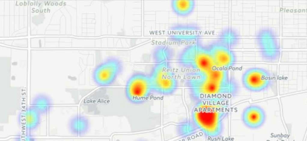 Blue lights, according to the 2018 Annual Security and Fire Safety Report by UFPD, are “non-dial, outdoor emergency telephones…located at strategic points throughout campus.” There are over 300 of these blue lights on UF’s campus, but as rally-attendee and NAACP-member Venecia Street said, “If you look on a map, there is a giant empty space on fraternity row that has residential buildings that aren’t being covered by blue lights.”